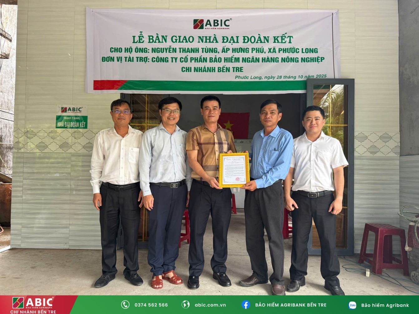 Chiều ngày 28/10/2025, tại ấp Hưng Phú, xã Phước Long, tỉnh Vĩnh Long, Bảo hiểm Agribank Chi nhánh Bến Tre đã phối hợp cùng chính quyền địa phương tổ chức lễ bàn giao nhà “Đại đoàn kết” cho hộ gia đình ông Nguyễn Thanh Tùng – thuộc diện hộ nghèo, gặp khó khăn về nhà ở.