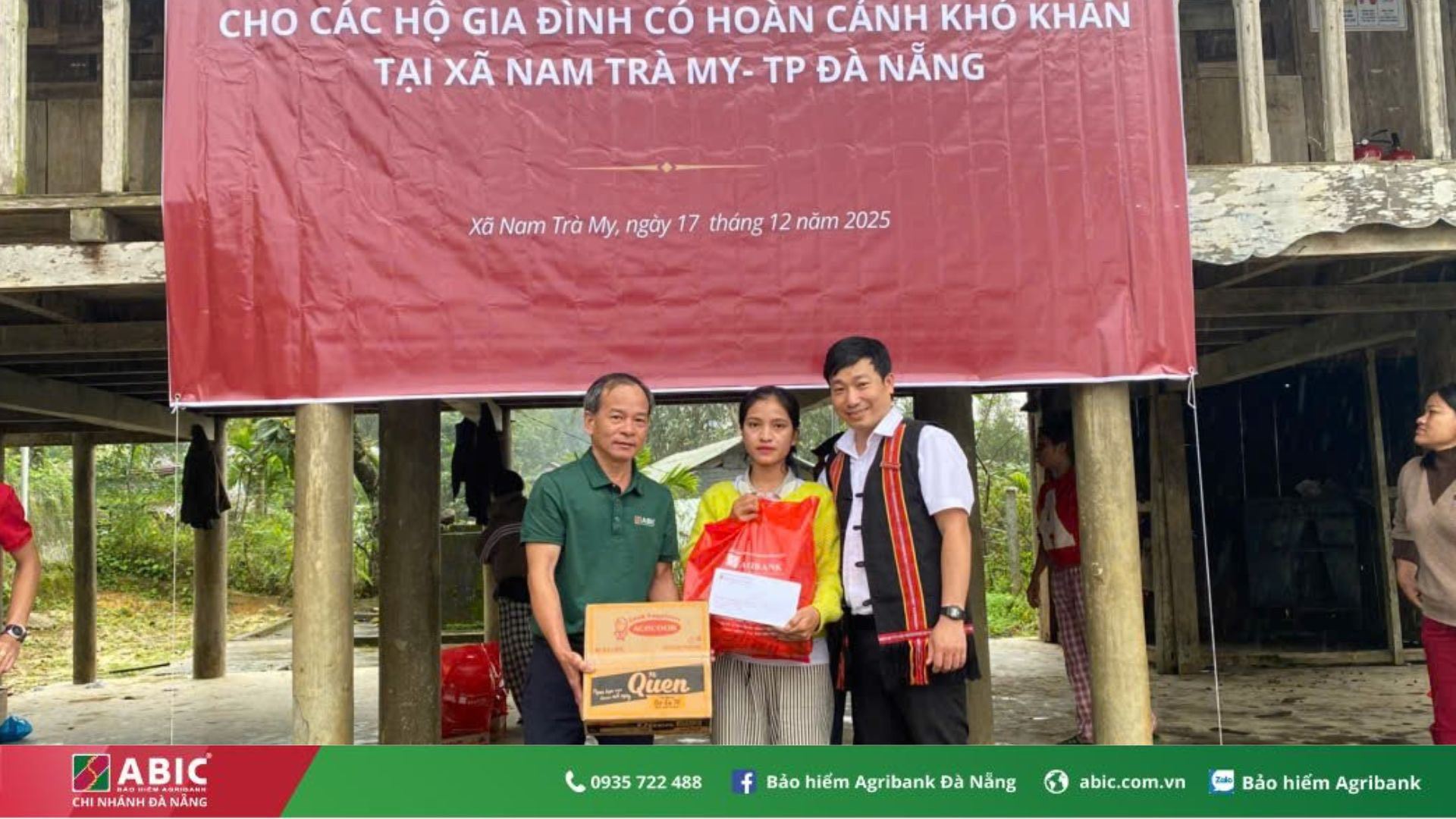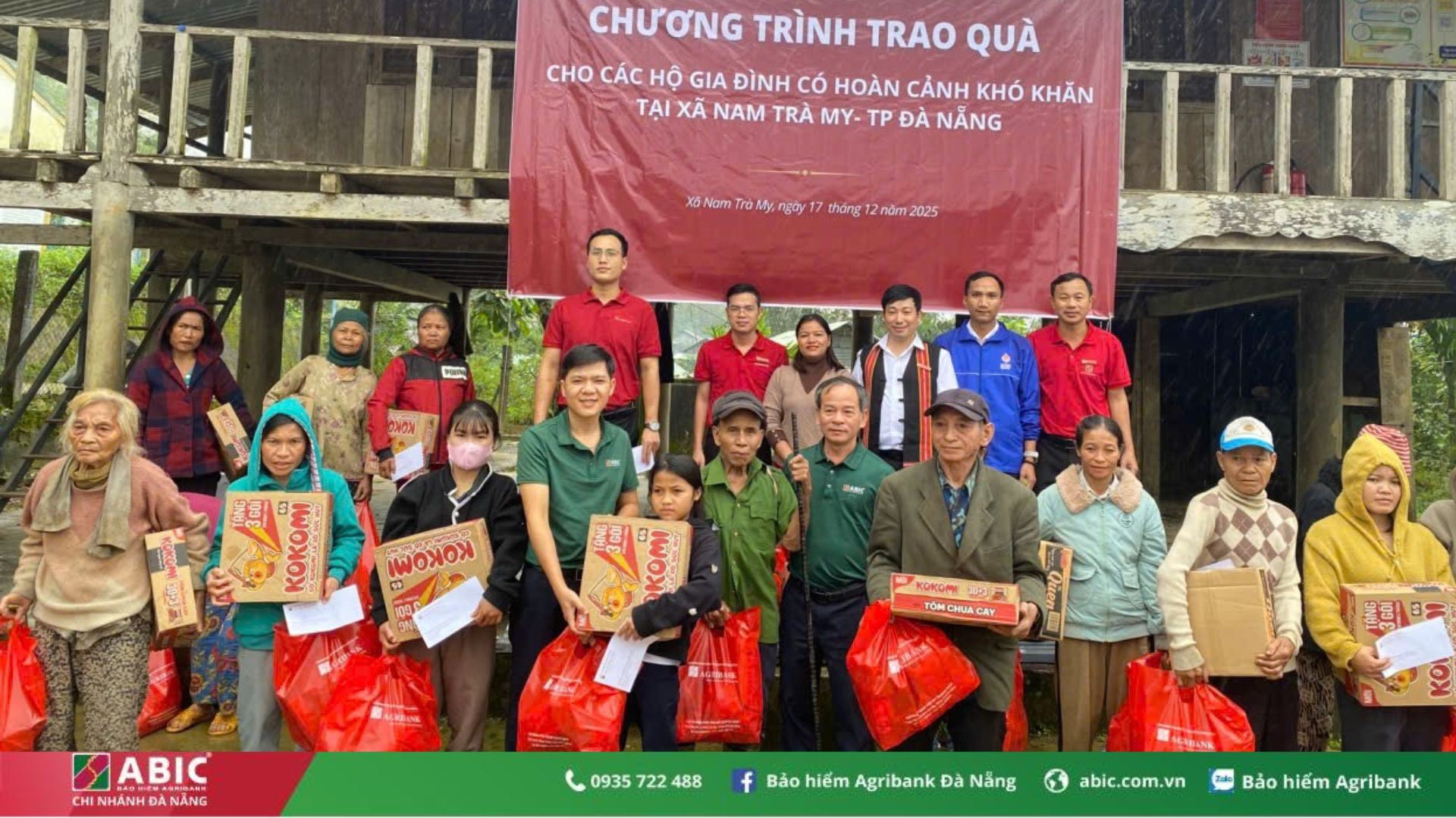 Ngày 17/12/2025, Phòng Kinh doanh khu vực Quảng Nam – Bảo hiểm Agribank Đà Nẵng đã phối hợp cùng Agribank Chi nhánh Nam Trà My, Quảng Nam tổ chức chương trình trao quà an sinh xã hội cho các hộ gia đình có hoàn cảnh khó khăn tại vùng cao xã Nam Trà My, TP. Đà Nẵng. Chương trình đã trao tặng 20 suất quà, mỗi suất trị giá 700.000 đồng, với tổng kinh phí 14.000.000 đồng, được trích từ nguồn an sinh xã hội của Bảo hiểm Agribank Đà Nẵng và sự đóng góp, chung tay của cán bộ Agribank Chi nhánh Nam Trà My, Quảng Nam.