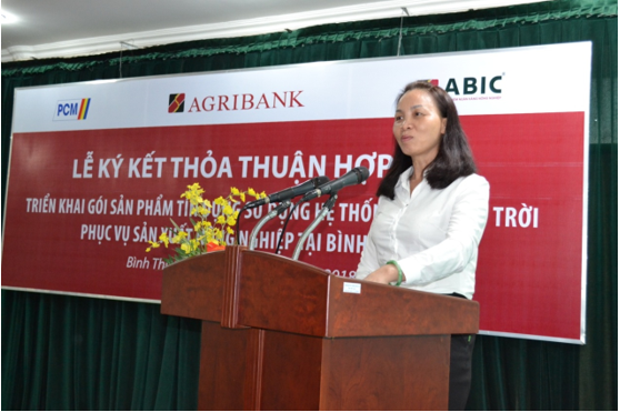 Chiều ngày 13/09/2018, Agribank tỉnh Bình Thuận tổ chức Lễ ký kết thỏa thuận hợp tác triển khai gói tín dụng sử hệ thống điện mặt trời phục vụ sản xuất nông nghiệp tại Bình Thuận giữa ba bên, gồm Agribank Bình Thuận, Công ty CP Bảo hiểm Ngân hàng Nông nghiệp (ABIC) và Trung tâm phát triển và ứng dụng công nghệ môi trường.
