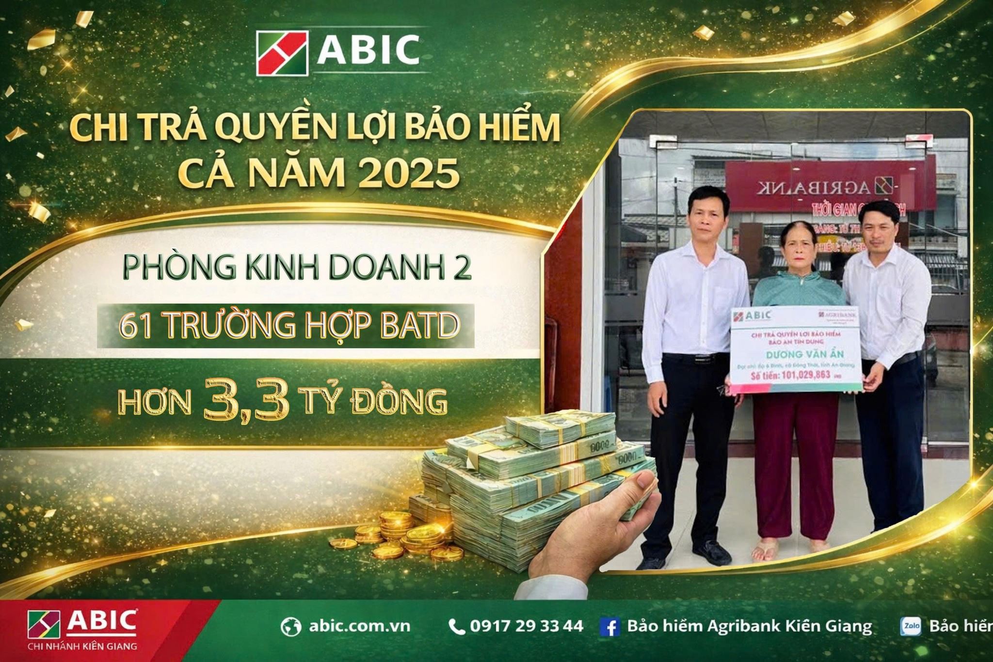 Công tác chi trả quyền lợi bảo hiểm tại Bảo hiểm Agribank Kiên Giang luôn được thực hiện đúng quy trình, nhanh chóng, minh bạch và kịp thời, đảm bảo quyền lợi chính đáng của khách hàng. Qua đó, đơn vị không chỉ thể hiện tinh thần trách nhiệm mà còn củng cố niềm tin của người dân và doanh nghiệp đối với thương hiệu Bảo hiểm Agribank.