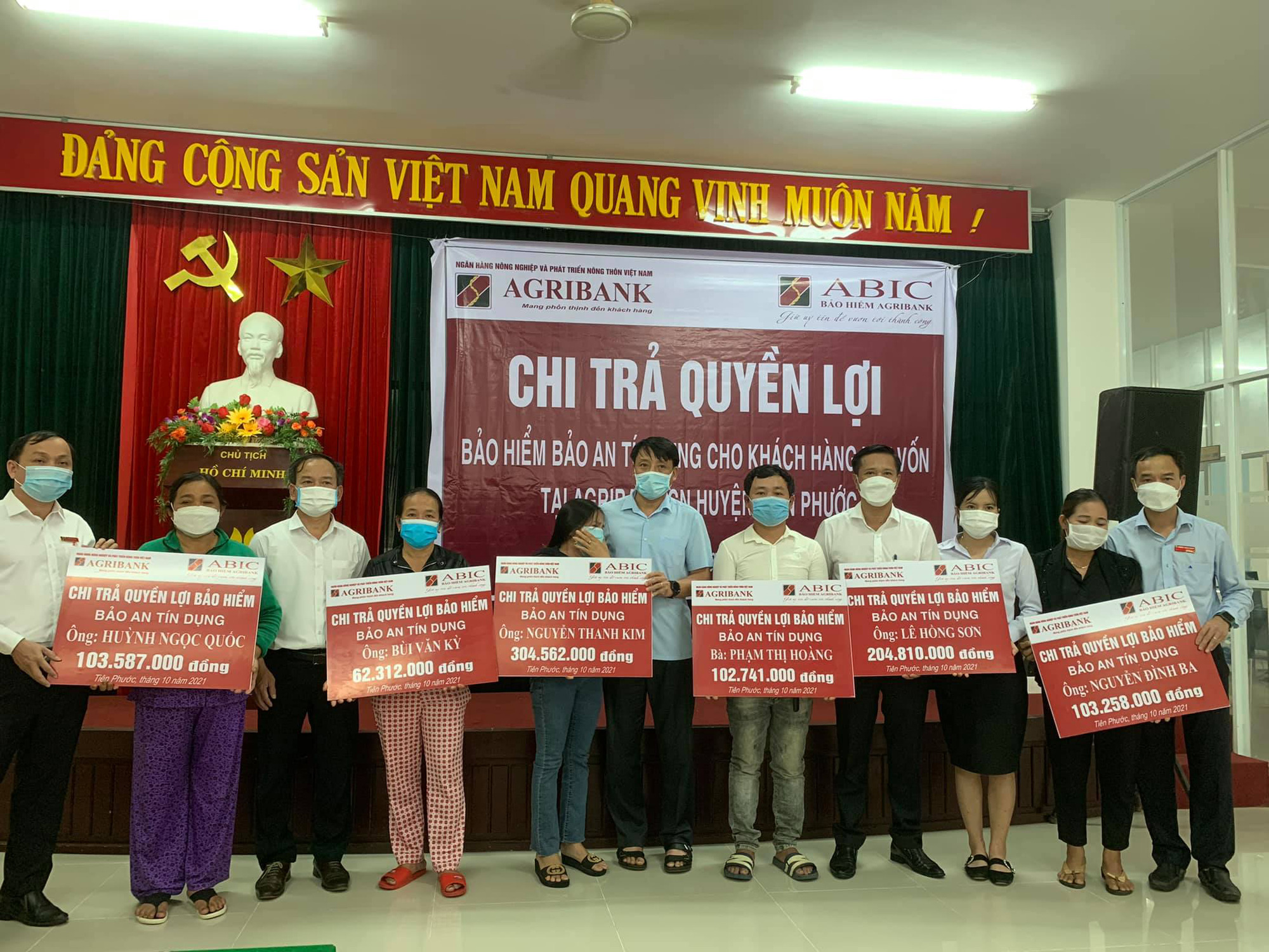 Thời gian qua, những khách hàng này không may bị bệnh đột ngột và qua đời. Khi nhận được thông tin từ gia đình khách hàng, đại diện Công ty Bảo hiểm Agribank đã phối hợp với Agribank Tiên Phước đến trực tiếp động viên thăm hỏi, thực hiện các thủ tục, hồ sơ chi trả bồi thường 100% theo mức trách nhiệm đã tham gia. Ngoài ra, công ty còn hỗ trợ một phần lãi vay và hỗ trợ thêm gia đình 1 triệu đồng tiền mai táng phí.