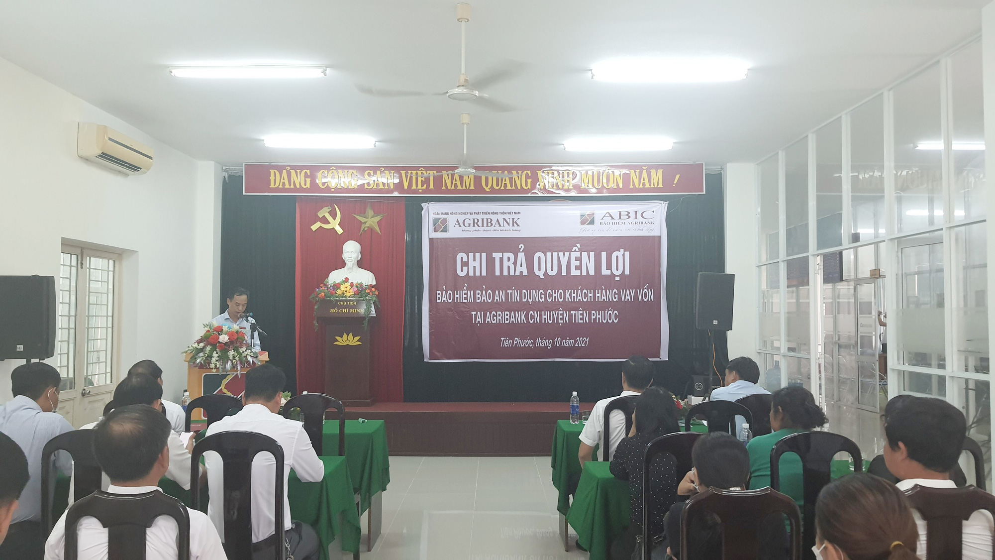 Quang cảnh buổi chi trả quyền lợi bảo hiểm Bảo an tín dụng của Công ty Bảo hiểm Agribank cho khách hàng. Ảnh: Trần Hậu.