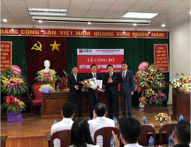 Sáng 9/3/2019 tại trụ sở Agribank tỉnh Hà Giang, ABIC Phú Thọ tổ chức lễ công bố  quyết định về việc thành lập Phòng Kinh doanh khu vực Hà Giang trực thuộc ABIC Phú Thọ và  quyết định điều động, bổ nhiệm cán bộ Phòng Kinh doanh khu vực Hà Giang.